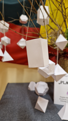 Šįkart pristatome dailės ir matematikos mokytojų organizuotą projektą „Platono kūnai“. Dalyvaudami projekte mokiniai susipažino su Platono erdvinėmis figūromis, išmoko jas atpažinti aplinkoje, gamino jų išklotines, klijavo, kūrybiškai apipavidalino ir pristatė mokyklos bendruomenės nariams.