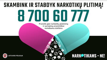 Lietuvos policija informuoja apie pradėjusią veikti Policijos telefono liniją „NARKOTIKAMS – NE“, kuri skirta pranešimams apie žinomus narkotinių medžiagų platinimo atvejus, siekiant užkirsti kelią jų platinimui ir taip apsaugoti visuomenę, o ypač vaikus, nuo neigiamų padarinių.